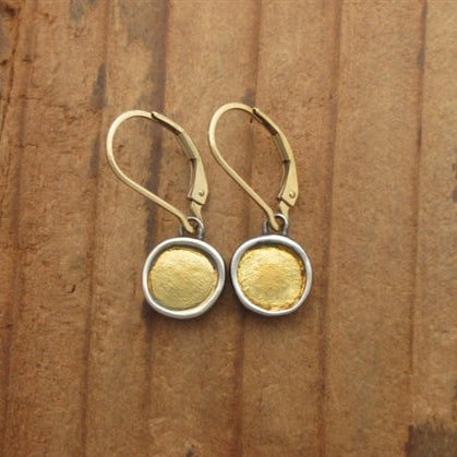 Small Round 24K Gold and Sterling Silver Earrings - Keum-Boo Dangles on Gold Fill Lever Backs