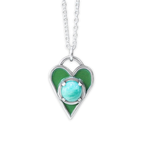 Enamel and Sterling Heart Necklace with Chrysocolla - Earthy Green and Blue Pendant on Adjustable Chain