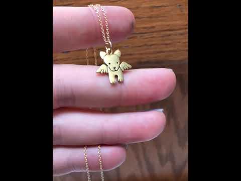A sweet memorial for your best friend. This angel dog necklace measures 1/2 of an inch high and is made from solid sterling silver and gold plated. Choose your gold filled chain length from the drop down menu.