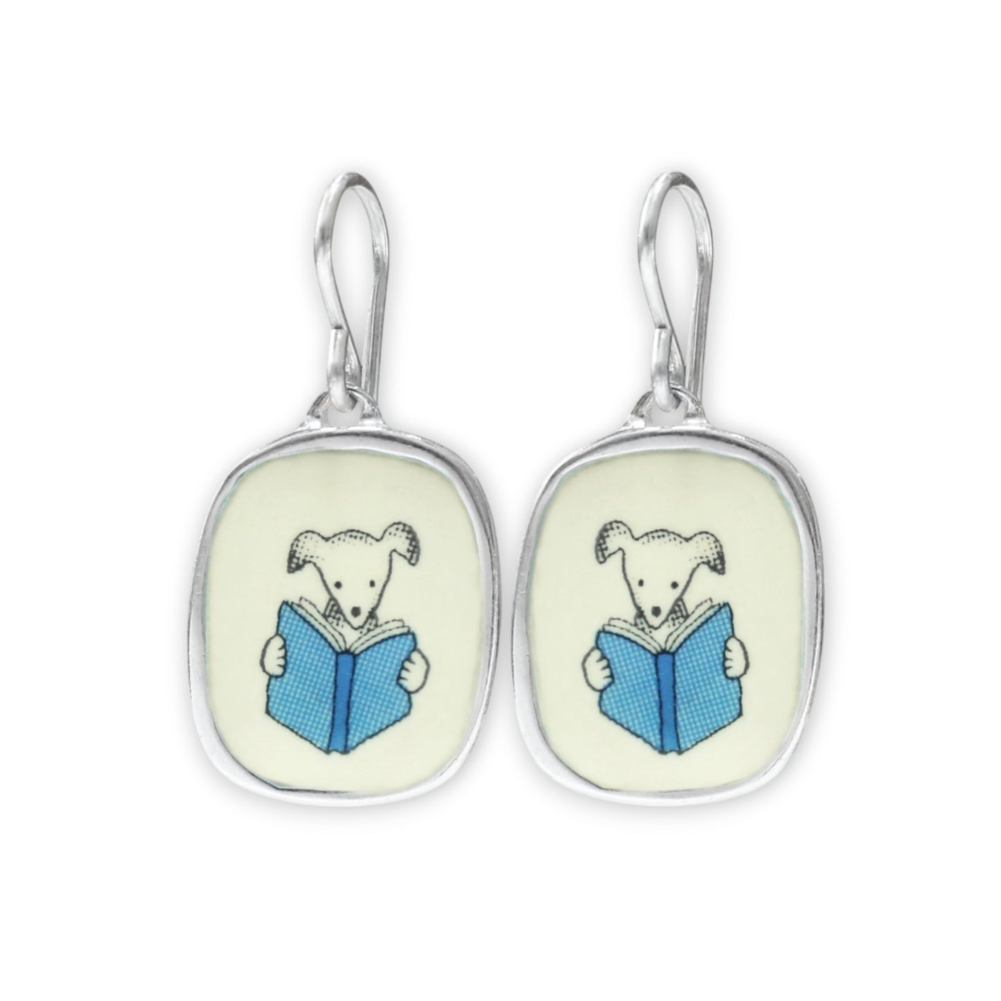 Book Dog Earrings - Sterling Silver and Enamel Reading Dog Dangle Earrings - Gift for Dog Mom, Student, Teacher, Bookworm, Writer
