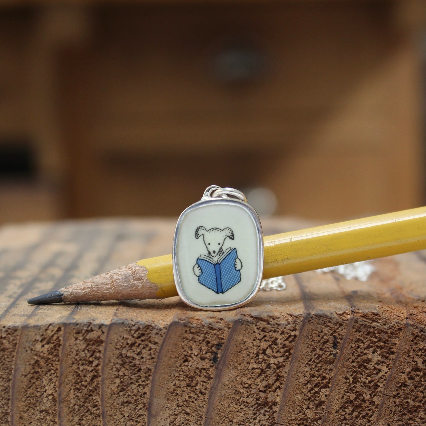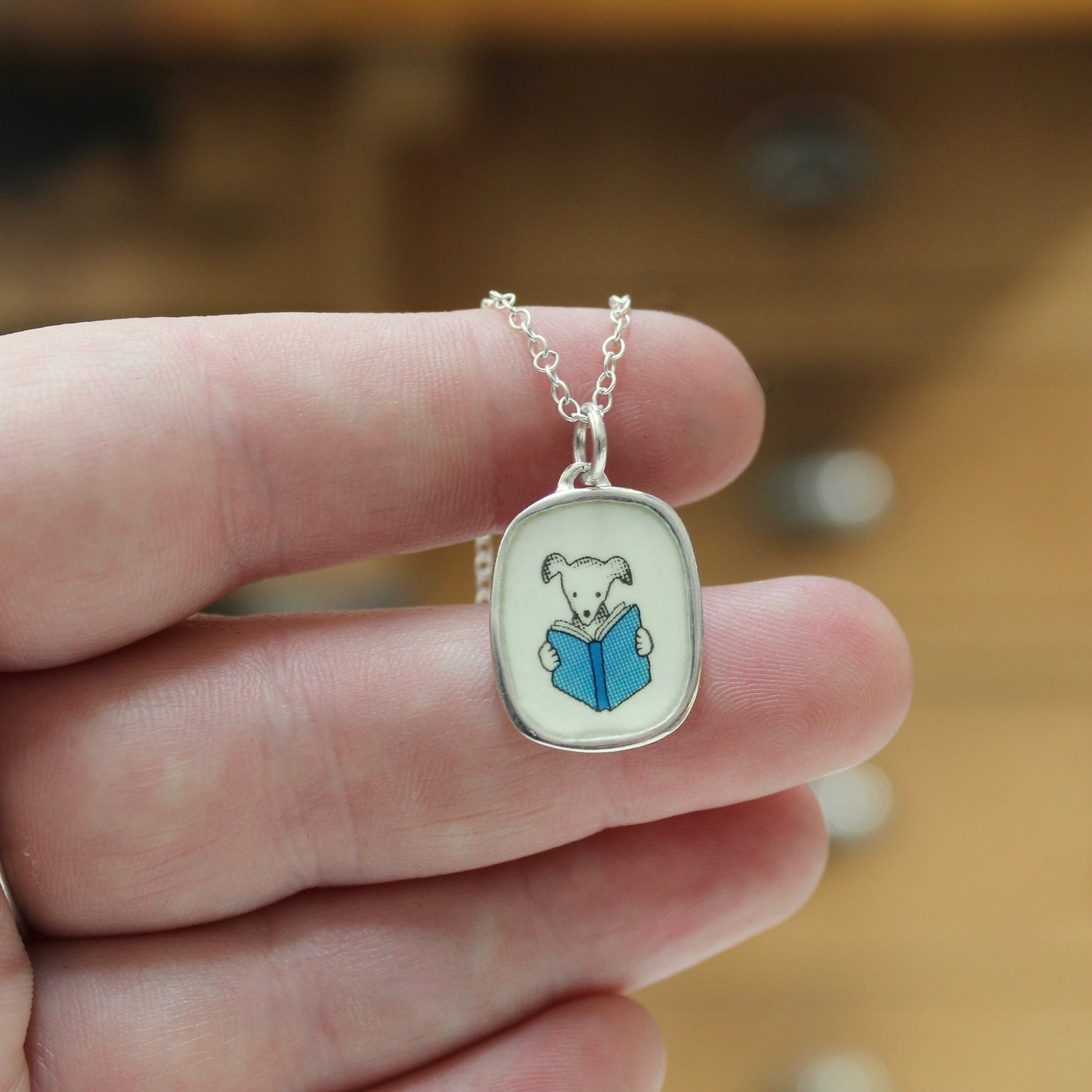 Book Dog Necklace - Sterling Silver and Enamel Dog Reading Pendant - Vintage Style Illustration
