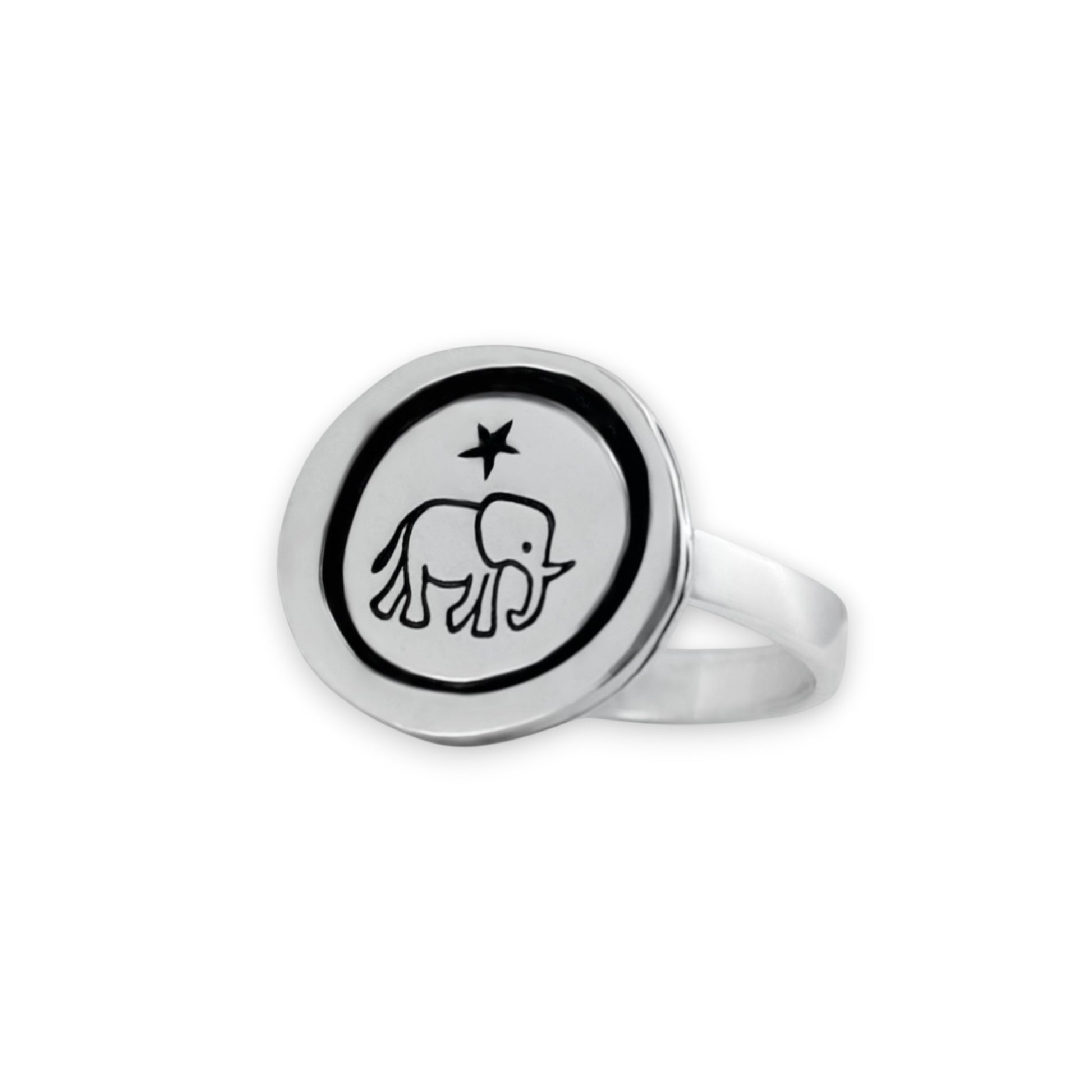 This sterling charm ring has an elephant drawing pulled from my sketch book placed in a smartly framed sterling silver setting with a star. The face of the ring measures 5/8 inch by 5/8 inch.