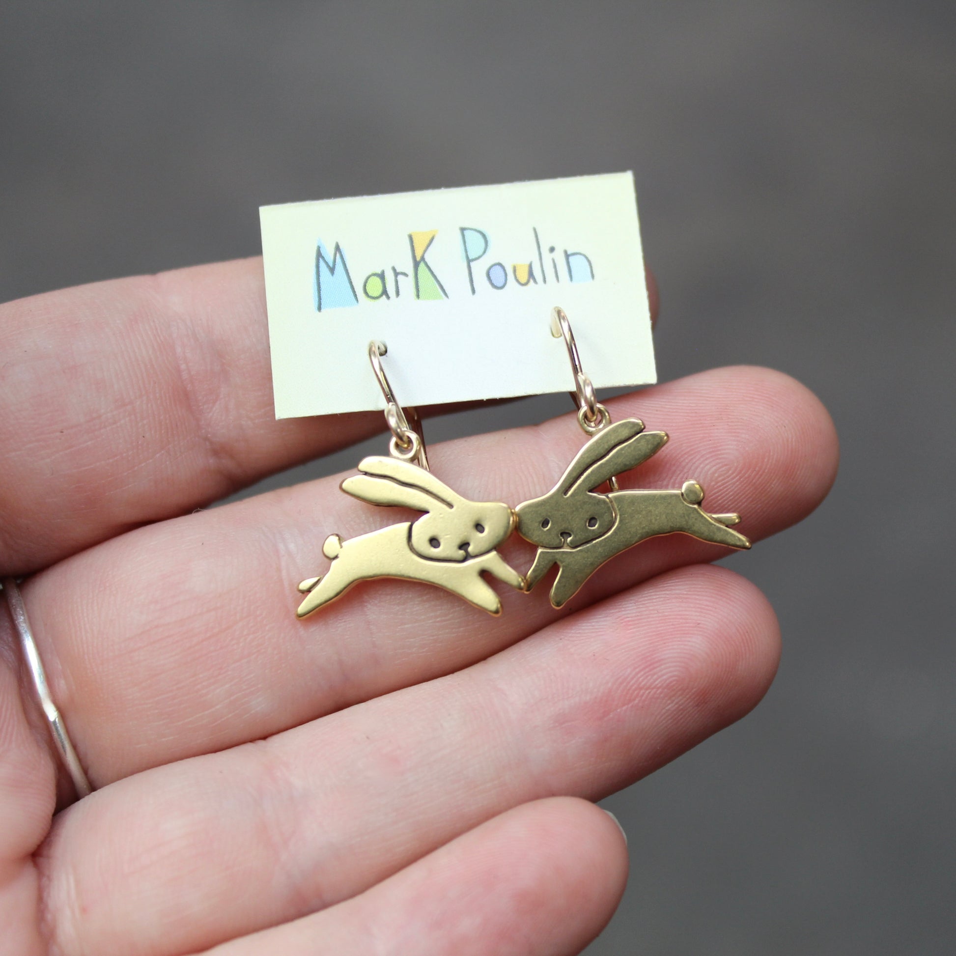 Anyone who loves rabbits will smile when they see these! They measure 1/2 of an inch long without the wire or 1 inch long with the ear wire. They are made from gold plated solid sterling silver and dangle from gold filled French ear wires. The design is on both sides.