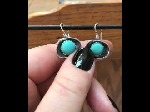 These incredible dangle earrings feature 10mm Kingman Turquoise gemstones in unique .925 sterling settings. They measure 3/4 of an inch across with a drop length of one inch, and they come on solid sterling french hook ear wires.