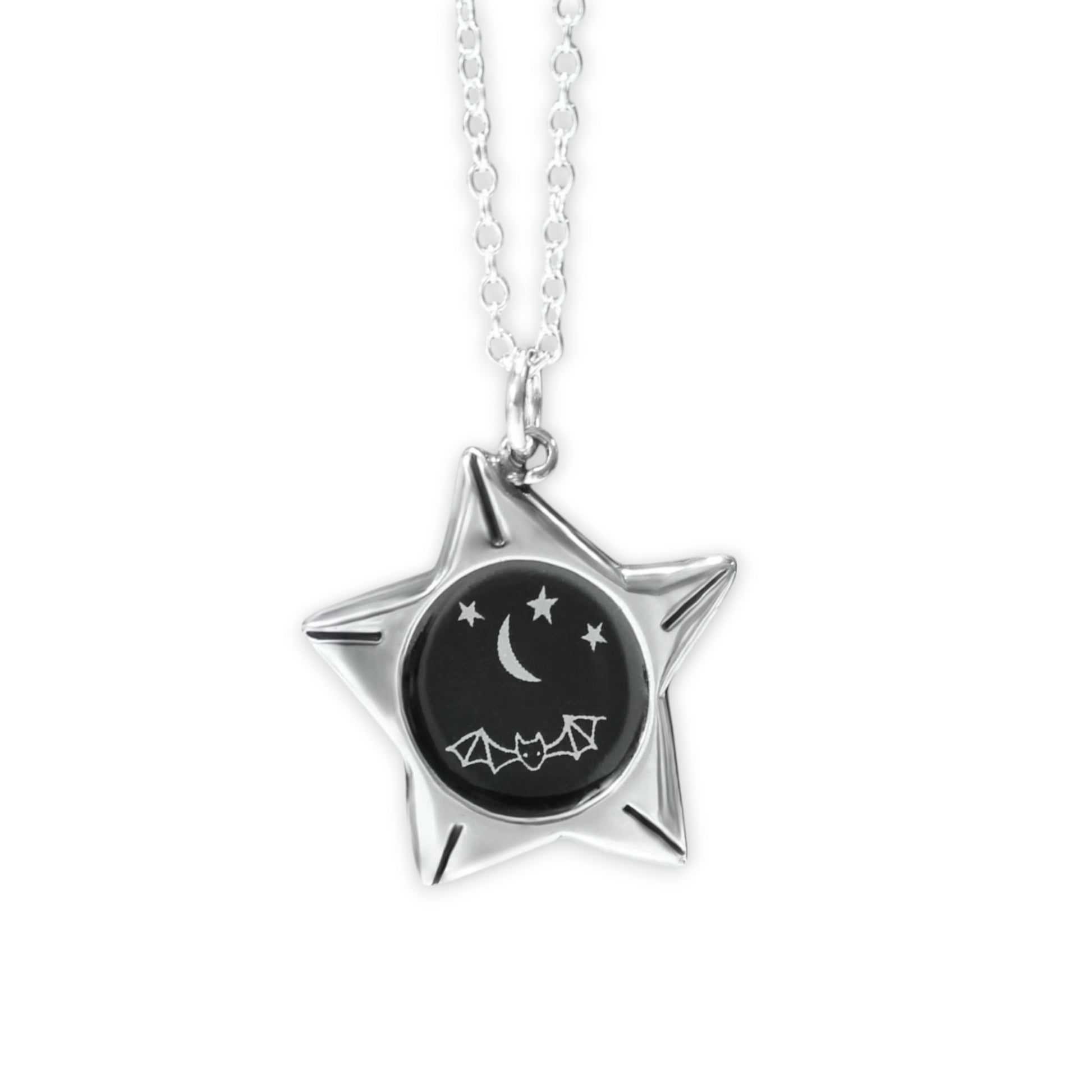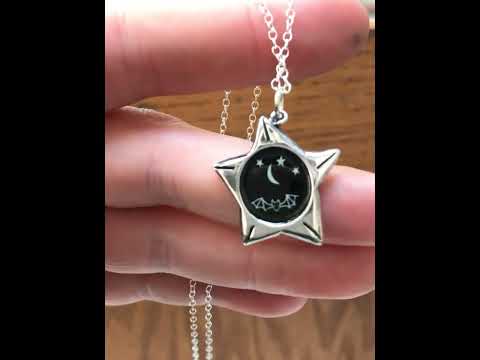 This adorable reversible necklace showcases a little bat and moon on one side, and twinkly stars against a black enamel night sky on the other. Made with solid sterling silver, it measures just under an inch tall and across. The drawing is fired on top of three layers of kiln fired vitreous enamel for a waterproof, strong and vibrant finish. It comes on a high quality sterling silver 16-20" adjustable chain.
