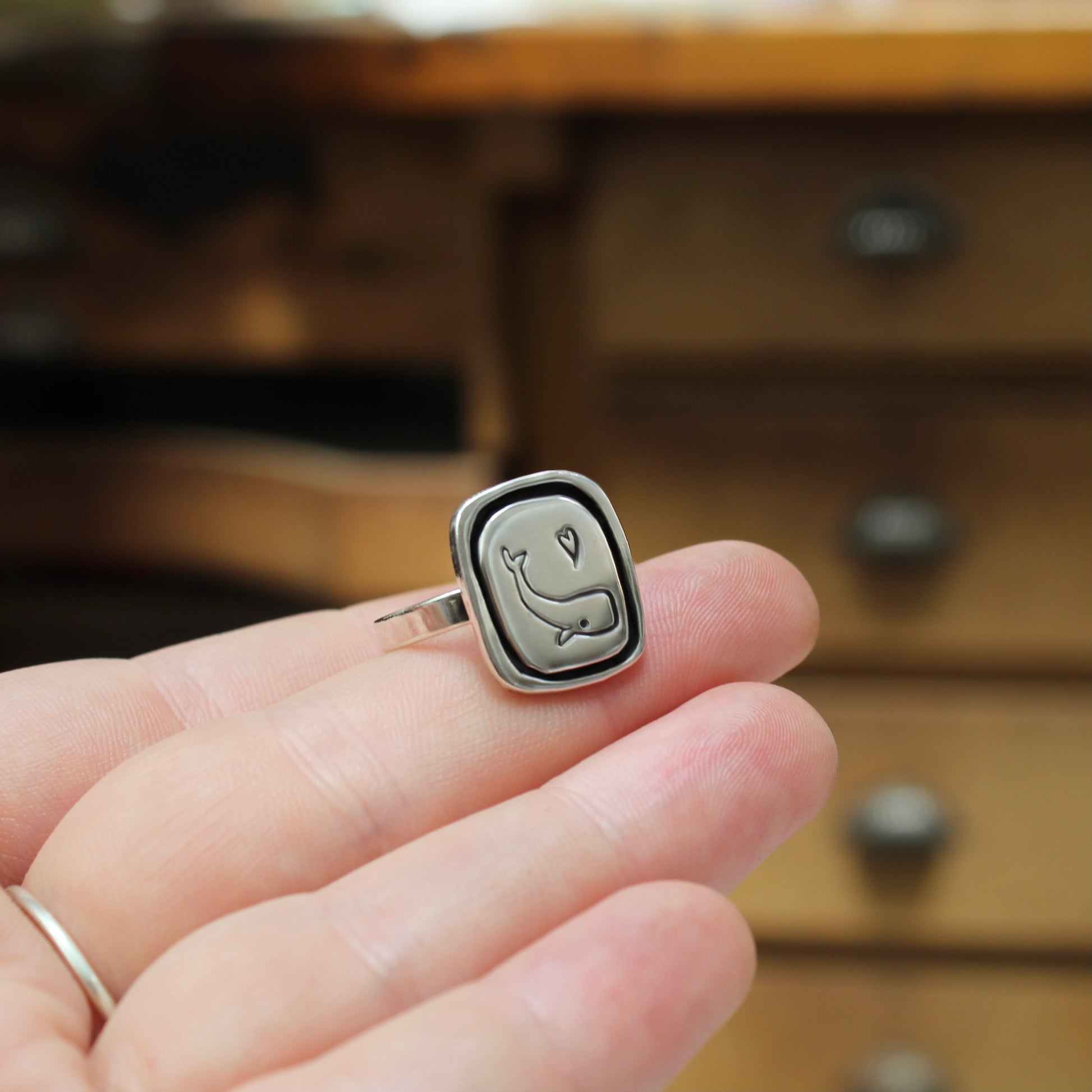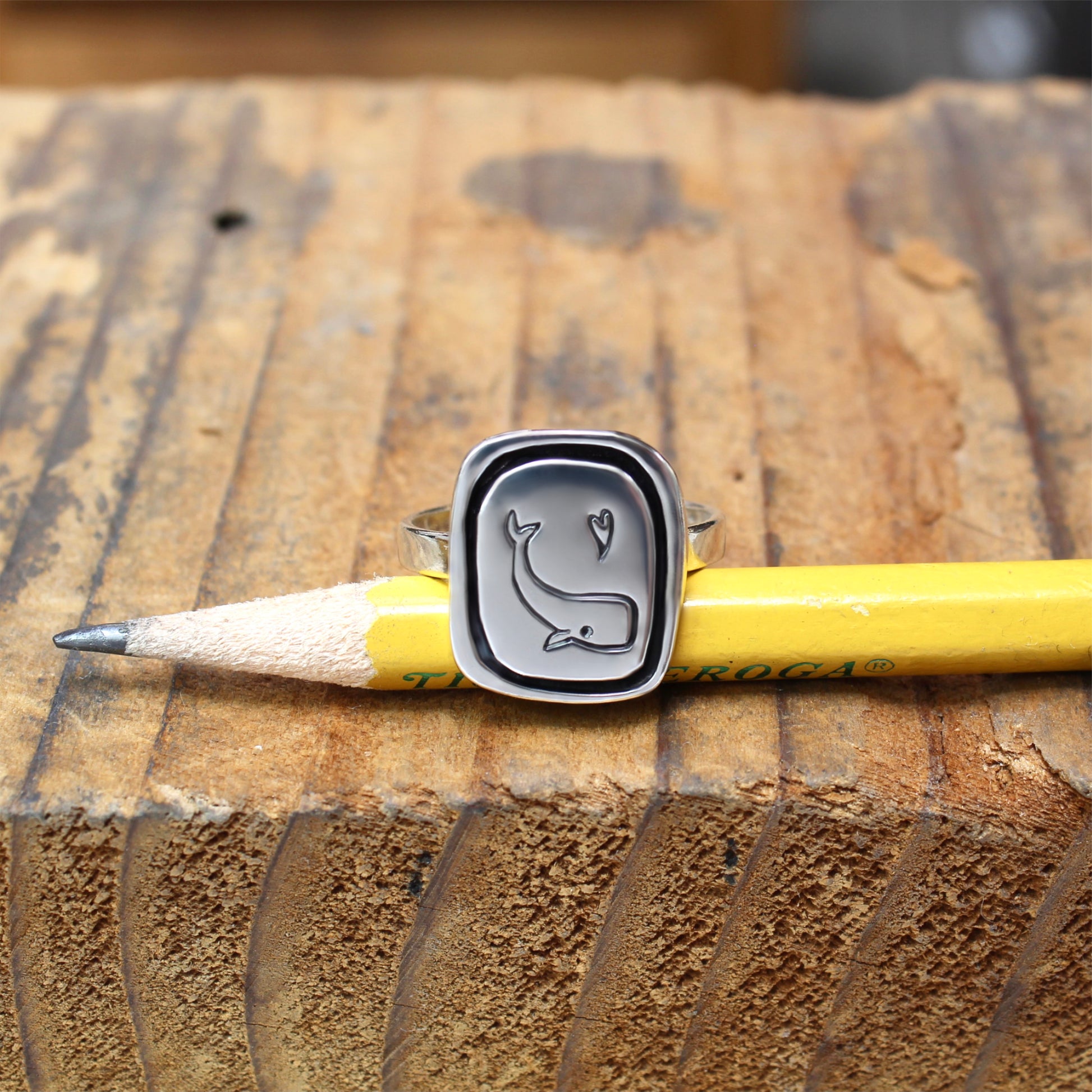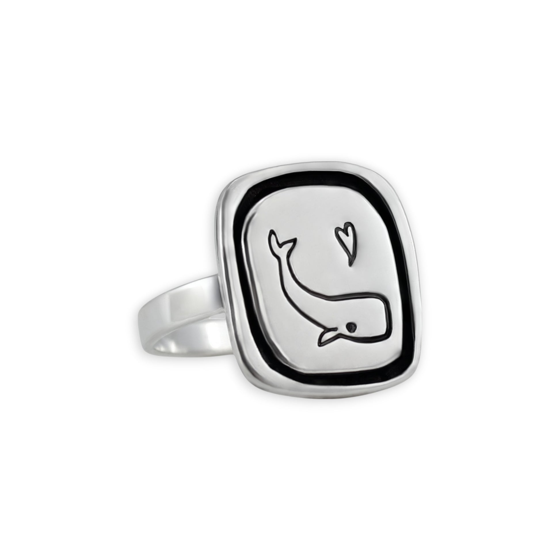 This smart looking whale ring measures 5/8ths inches tall and 1/2 an inch wide. Made entirely from sterling silver it comes in whole sizes 5 through 10.