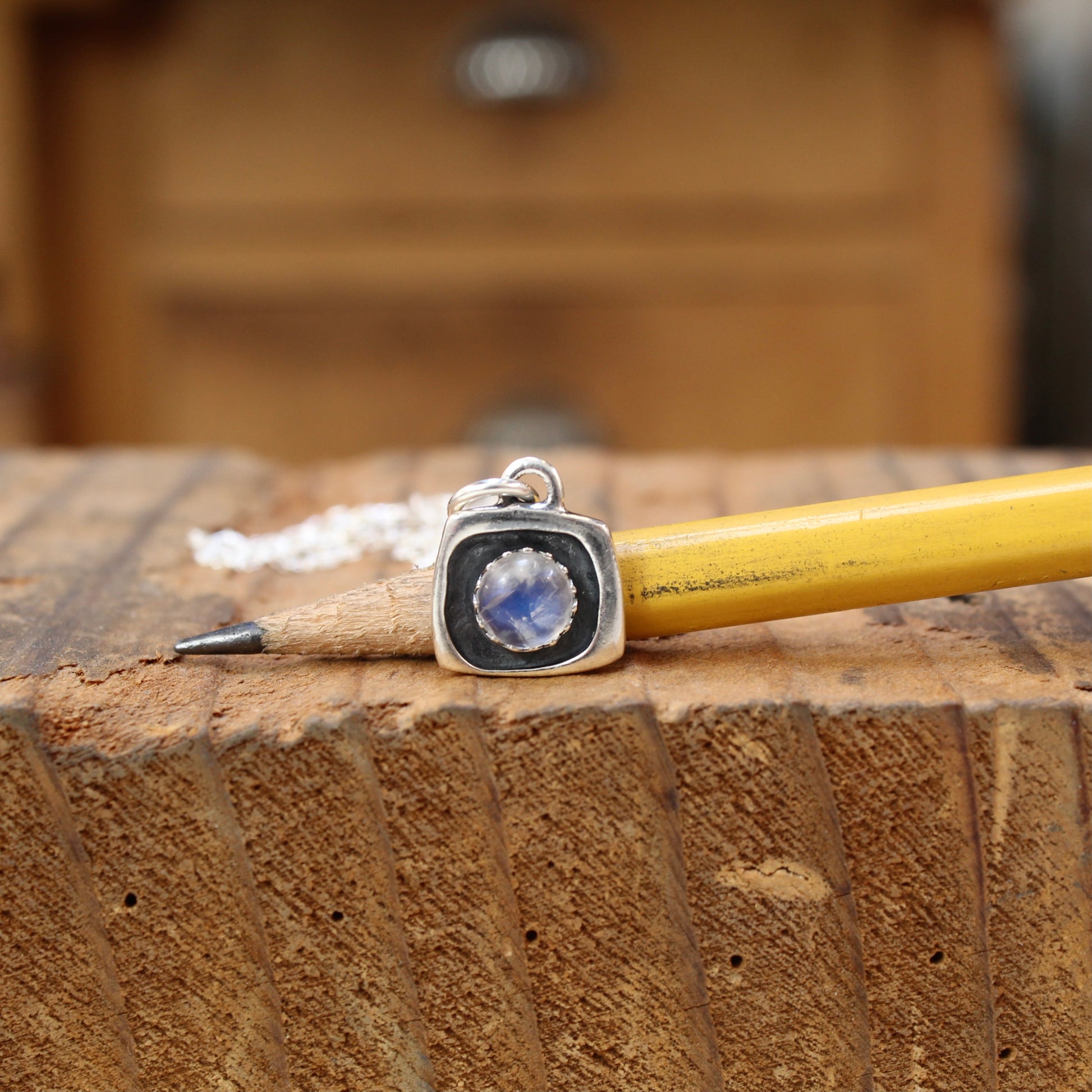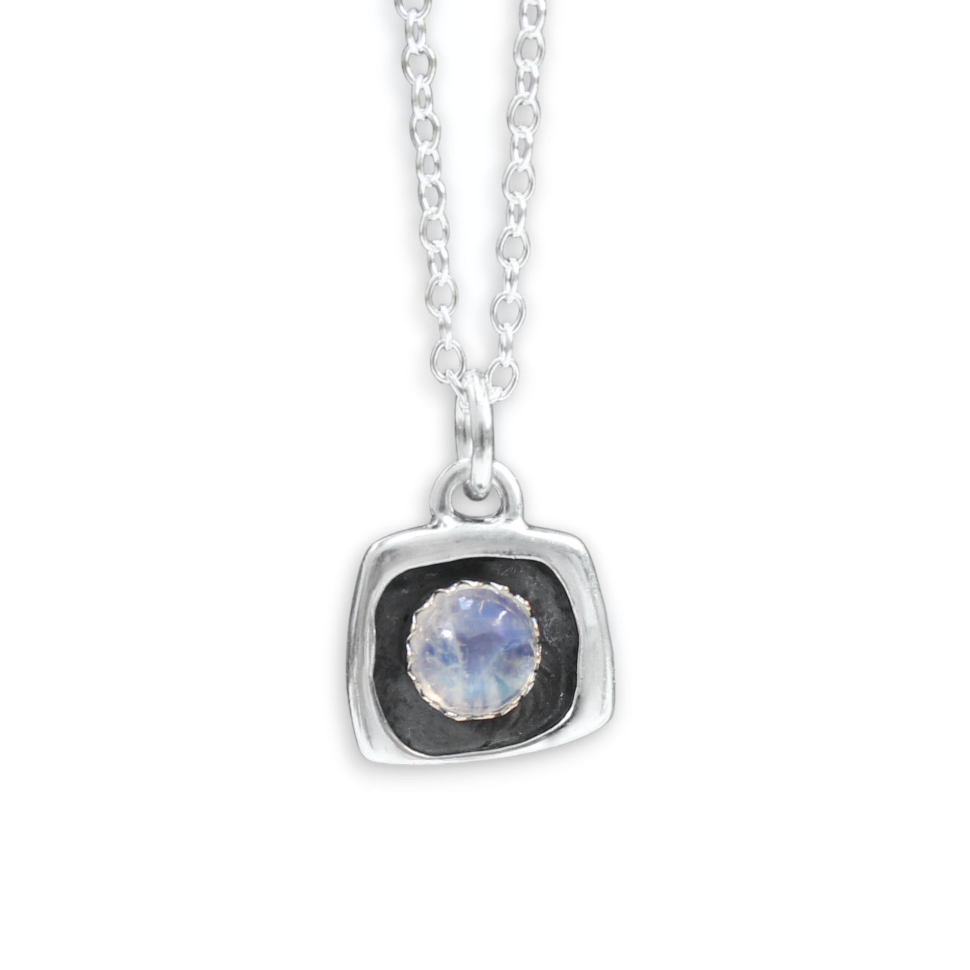 This gorgeous little moonstone pendant cast in solid sterling silver and soldered in my Oakland CA workshop. The moonstone is set in the center in a serrated bezel, in the shadow box style with a dark black patina. The half inch square pendant hangs from a sterling silver chain that is adjustable between 16 and 20 inches.