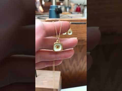 It measures 1/2 inch tall by a 1/2 inch wide and each pendant comes on a high quality gold filled chain, choose your length from the drop down menu.
