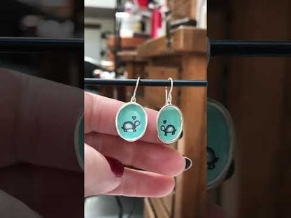 Turtle Earring - Adorable Turtle Enamel Drawing on Sterling Silver Dangle - Tortoise Jewelry