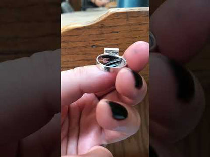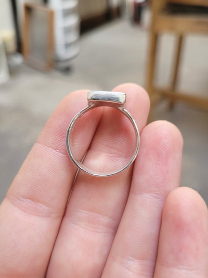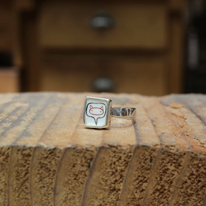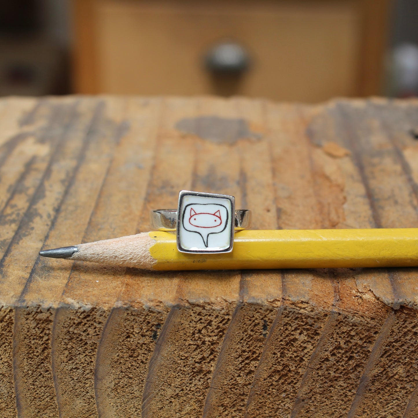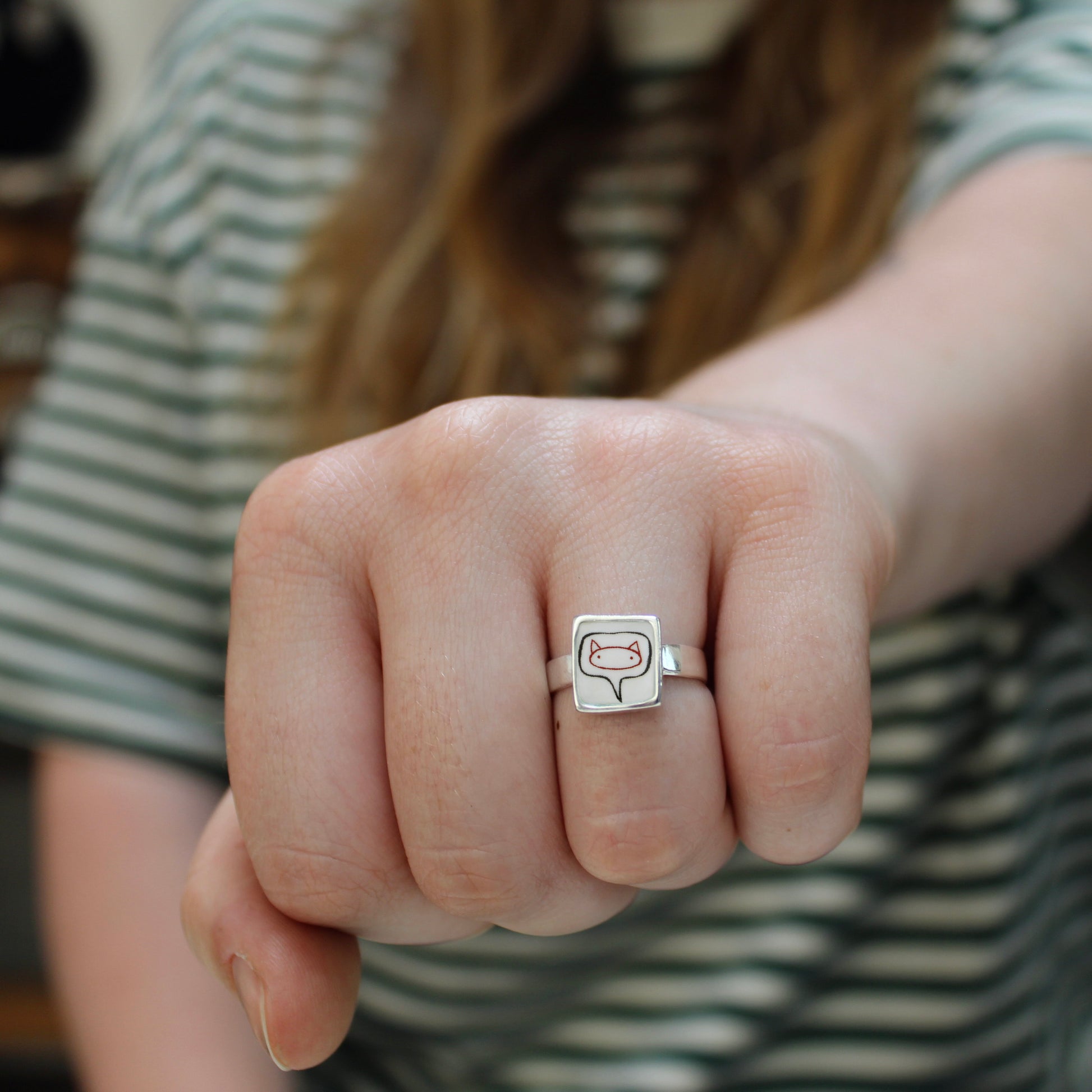 Each ring is cast in sterling silver, to which 3 layers of vitreous enamel are applied and fired. Finally, I apply and fire the custom screen prints made from my drawings. Adorable, durable, and unique!