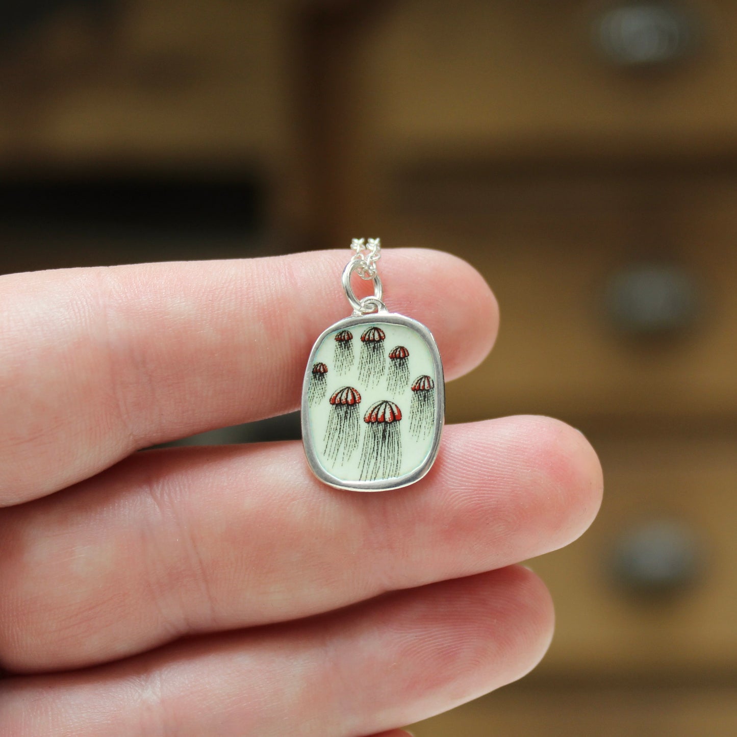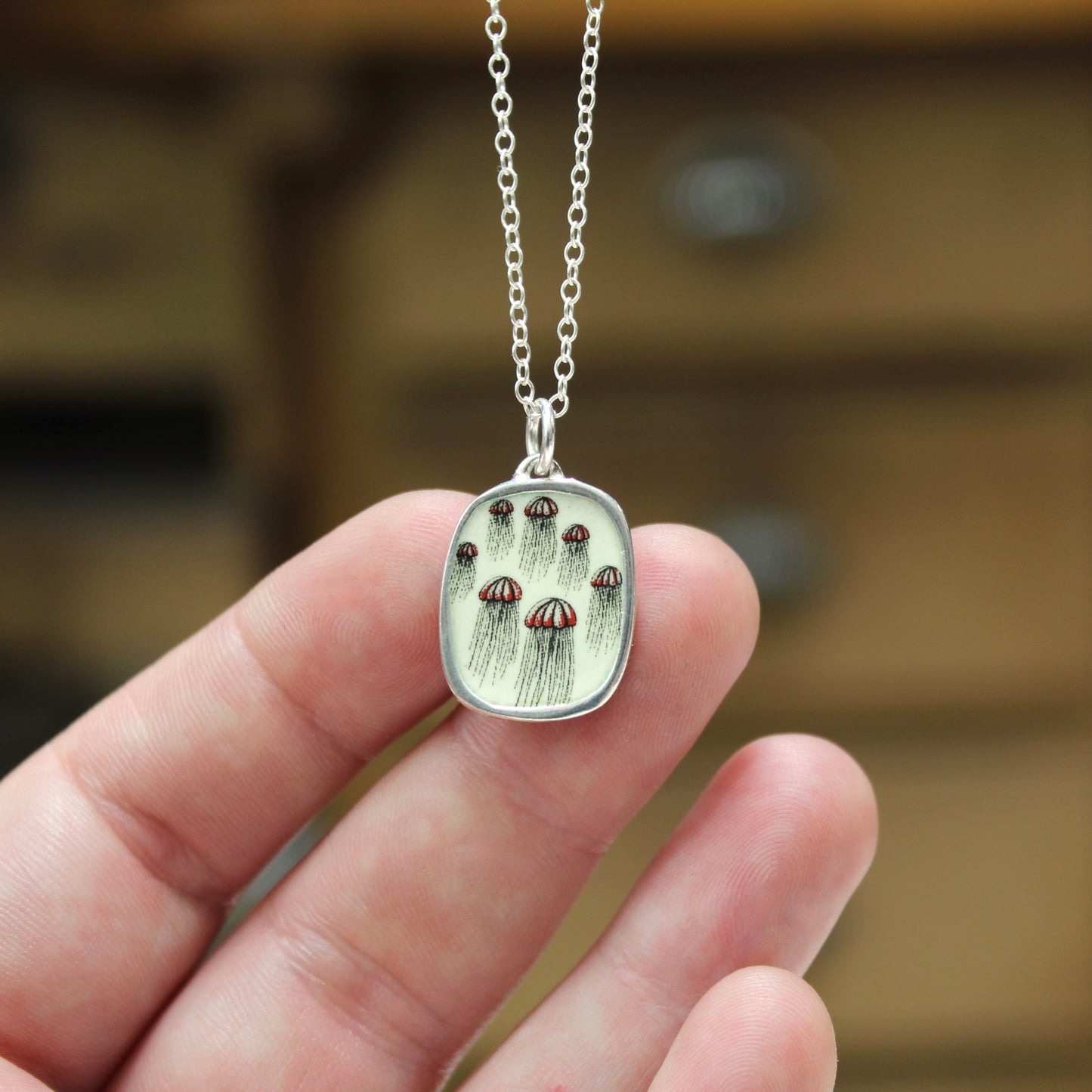 Jellyfish Necklace - Drawing of a Bloom of Jellyfish - Sterling Silver and Enamel Pendant on Adjustable Chain