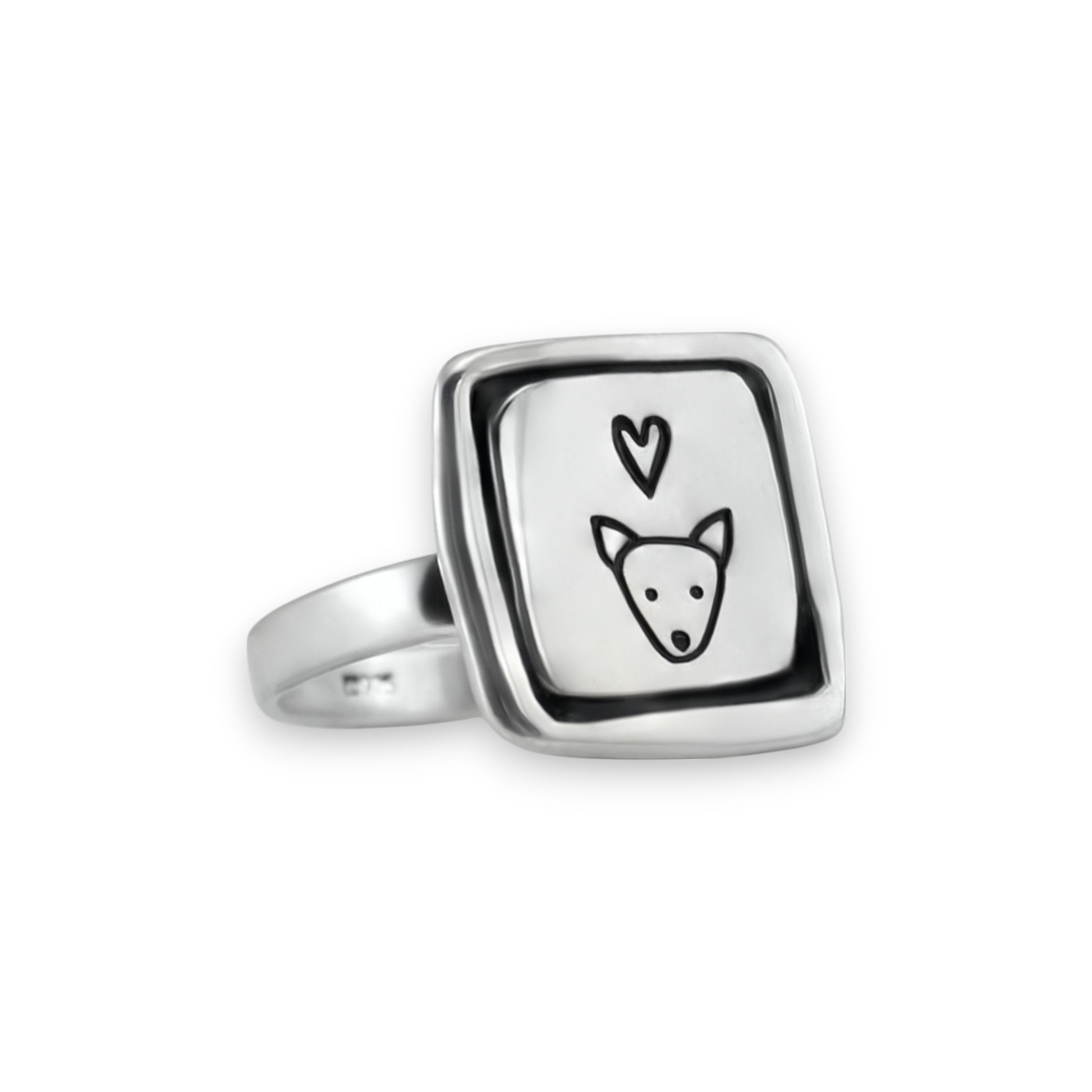 This adorable sterling charm ring has a dog etched in a smartly framed silver setting. The face of the ring measures 1/2 inch by 1/2 inch.