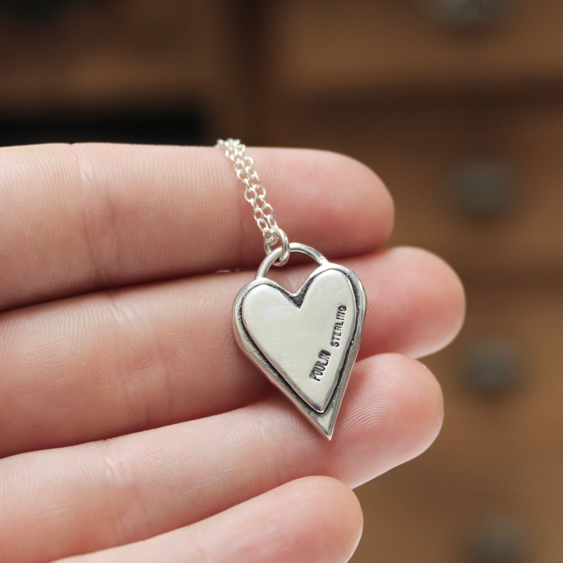 This finely crafted sterling silver heart necklace is made with 3 layers of gorgeous forest green enamel, kiln fired at 1400 degrees. This makes for a durable waterproof and vibrant pendant. It features an 8mm Chrysocolla gemstone neatly set in little silver prongs. It also has a layered heart detail along with my makers mark on the reverse side. This pendant comes on an adjustable sterling silver chain that can be clasped anywhere between 16 and 20 inches.