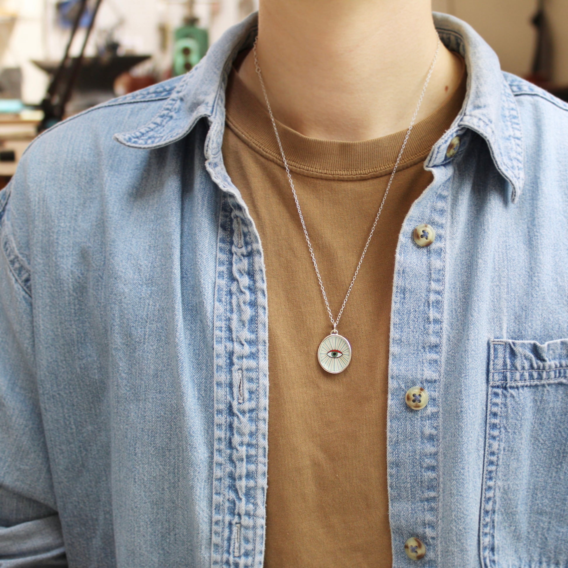For protection and good luck this sterling silver evil eye charm necklace measures one inch tall with a durable enamel illustration of an eye radiating protective vibrations.