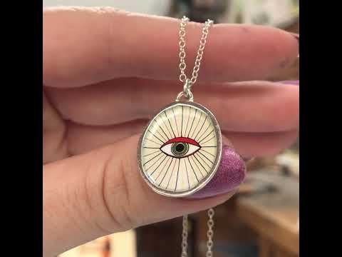 To make this piece I start with milled wax, then cast that wax pendant into metal and mold it so I can make multiples. The setting then gets a layer of vitreous enamel (fine glass) and fired at 1400 degrees in a kiln, four separate times, to build strength and color saturation . Finally I take an illustration from my sketchbook, turn it into an enamel screen print, and fire that on the top for a durable, waterproof and vibrant finish. So many steps.