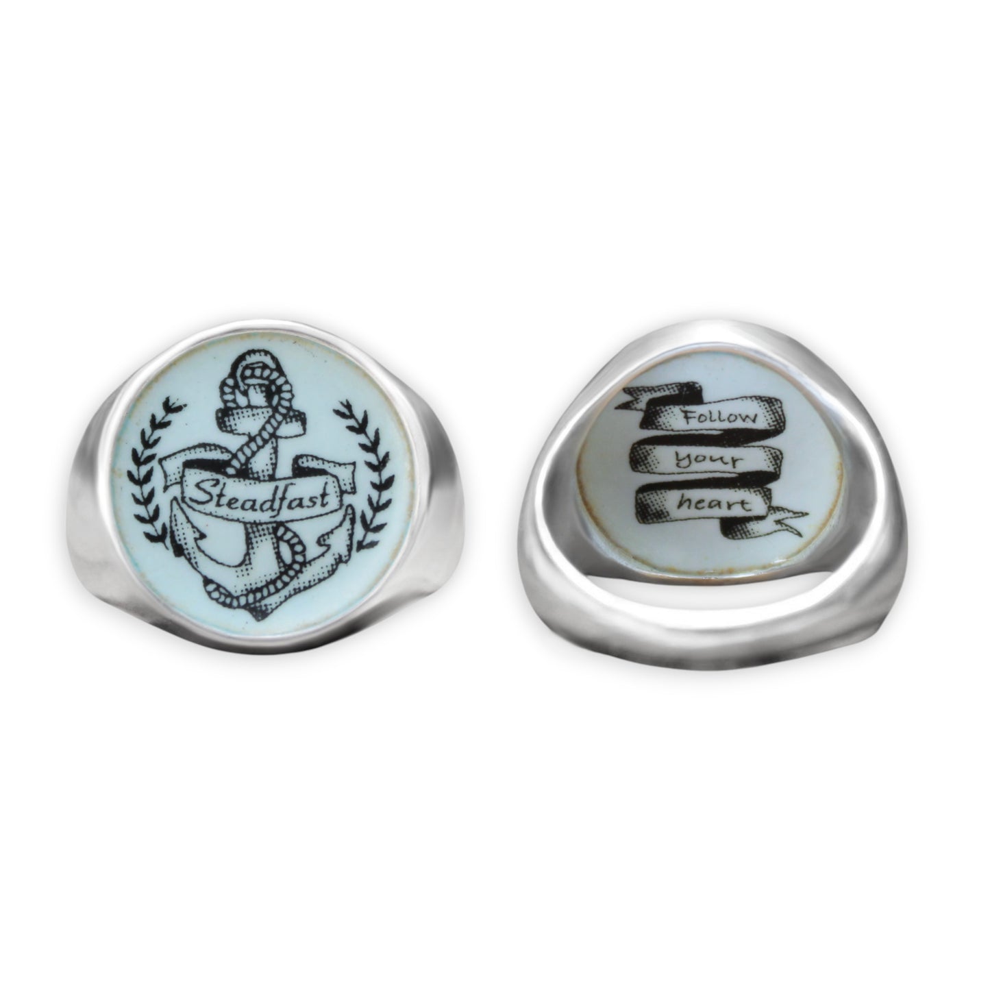 This ring has a tattoo style drawing of an anchor with the word "Steadfast" on a banner across the front. It evokes both adventure and romance.