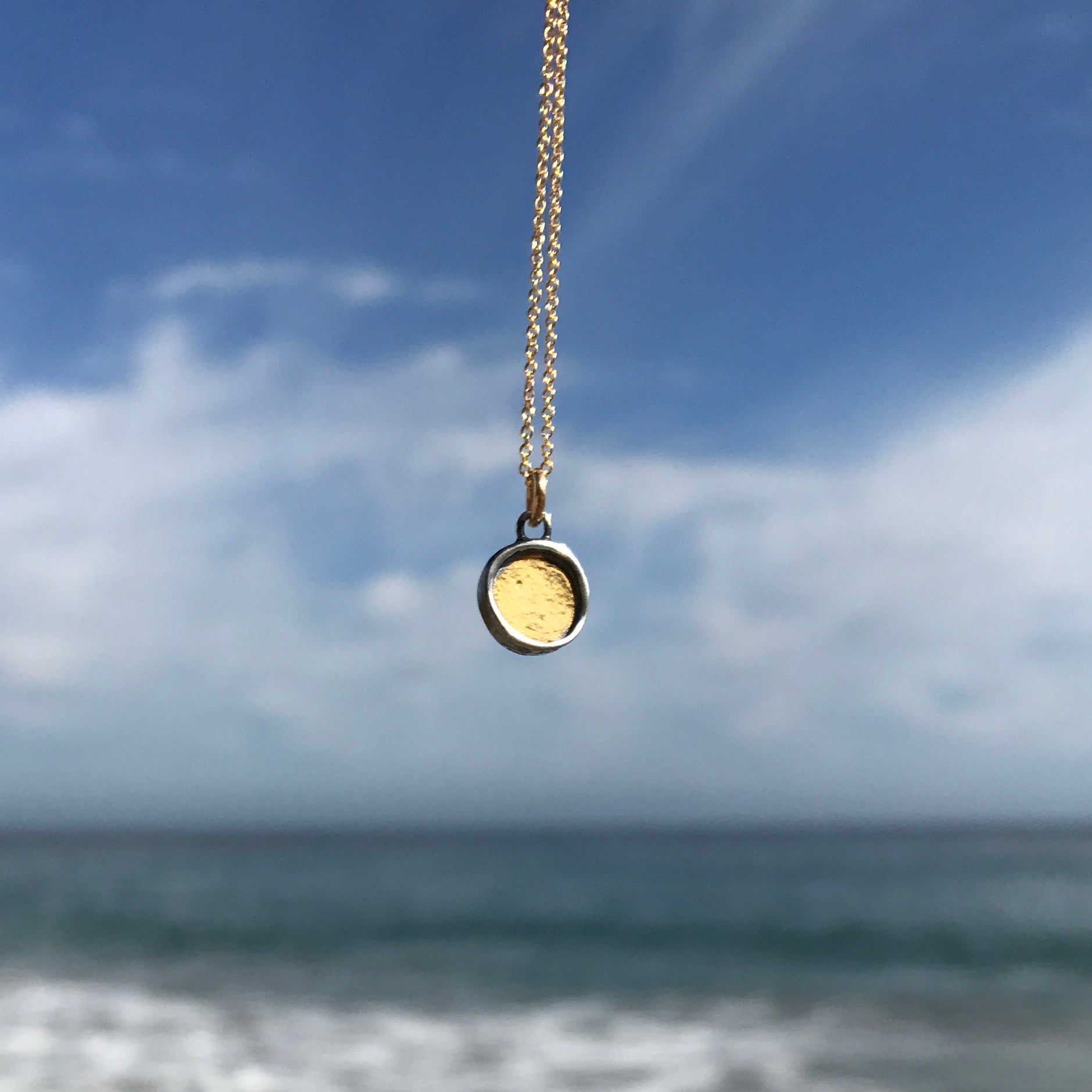 Beautiful 24K gold shines in the center of this modern pendant made using the Korean Keum-boo gilding technique. The sterling backing frames the gold circle making it stand out. The pendant comes on a gold filled chain. Choose your chain length from the drop down menu.
