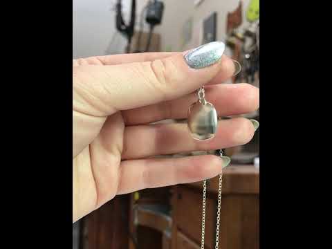 This sterling silver and enamel necklace measures about 3/4 of an inch tall and hangs from a 16 - 20 inch adjustable sterling silver chain with a spring ring clasp.