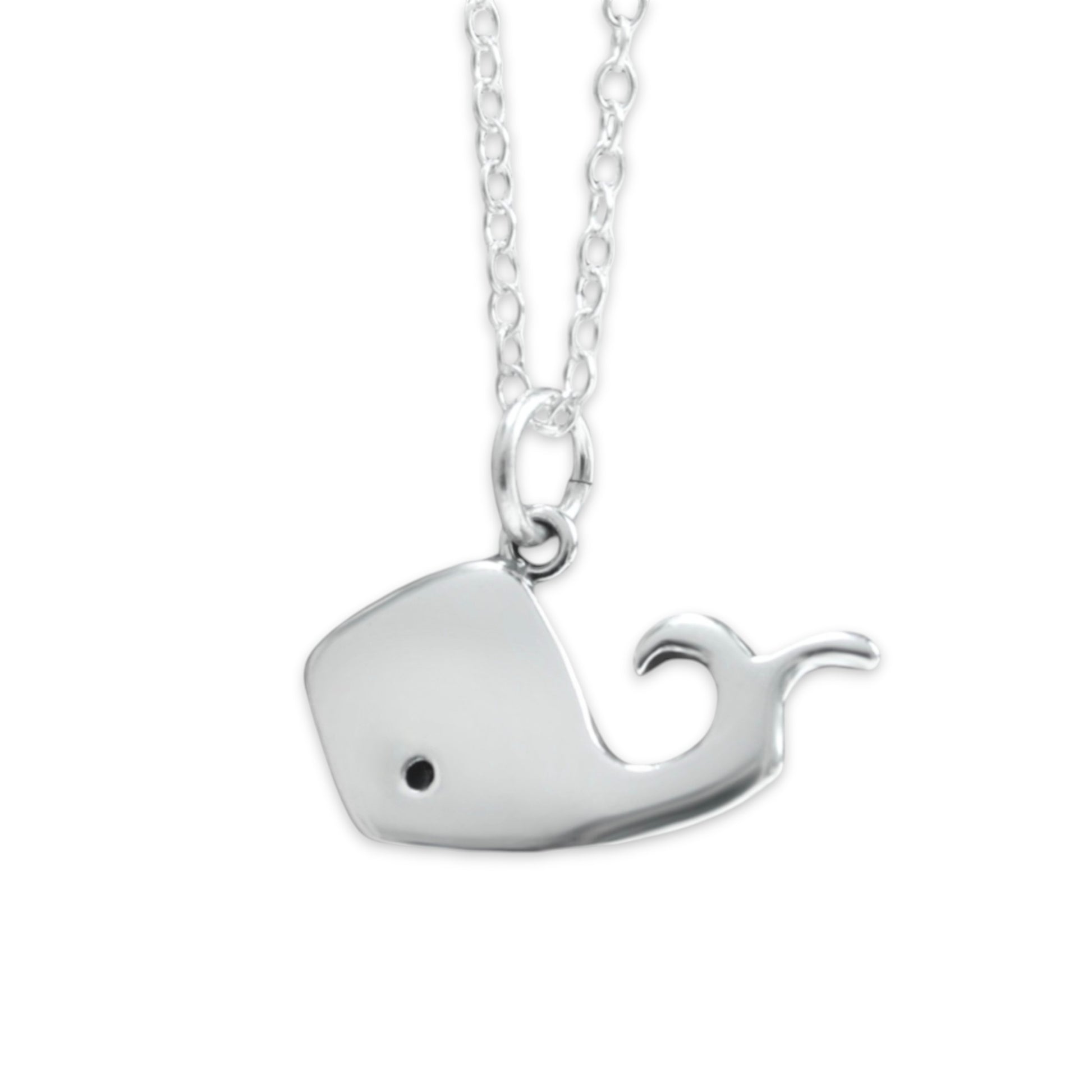 This sterling silver whale little charm necklace measures 1/2 of an inch tall and has the design on both sides.