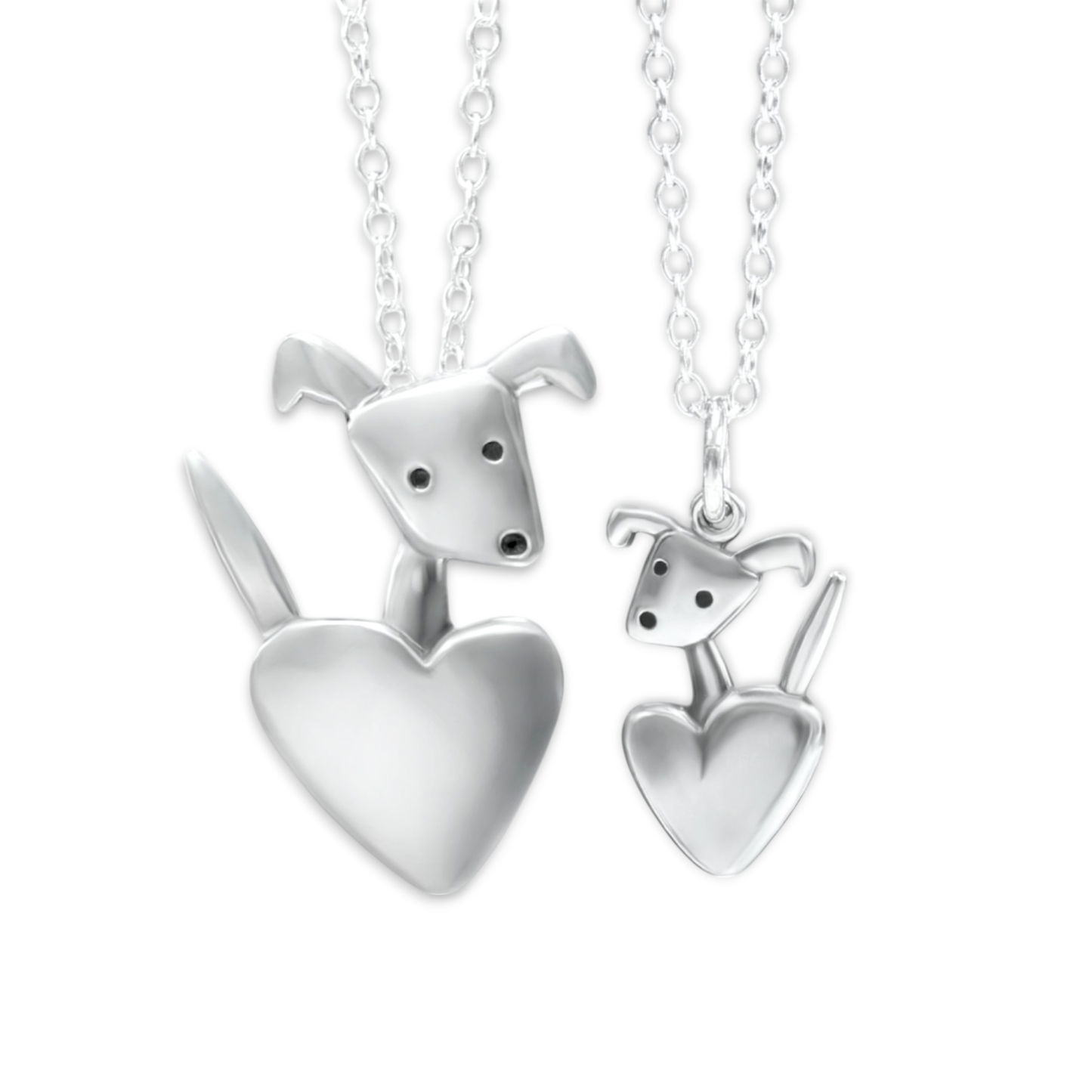 This is always one of my favorite sets. Two sterling Dogs, peeking out from behind big hearts. A great necklace set for dog lovers!