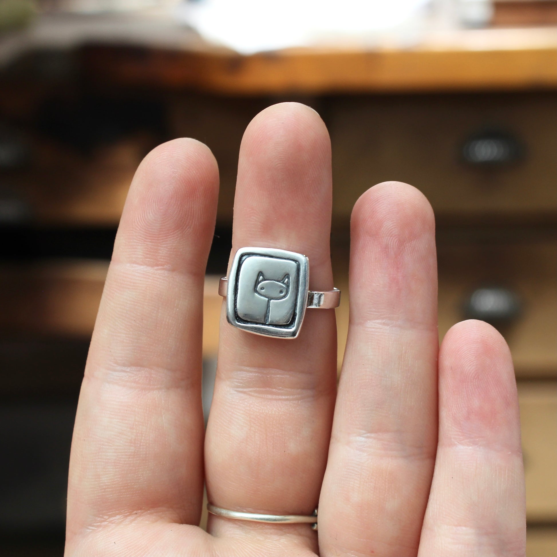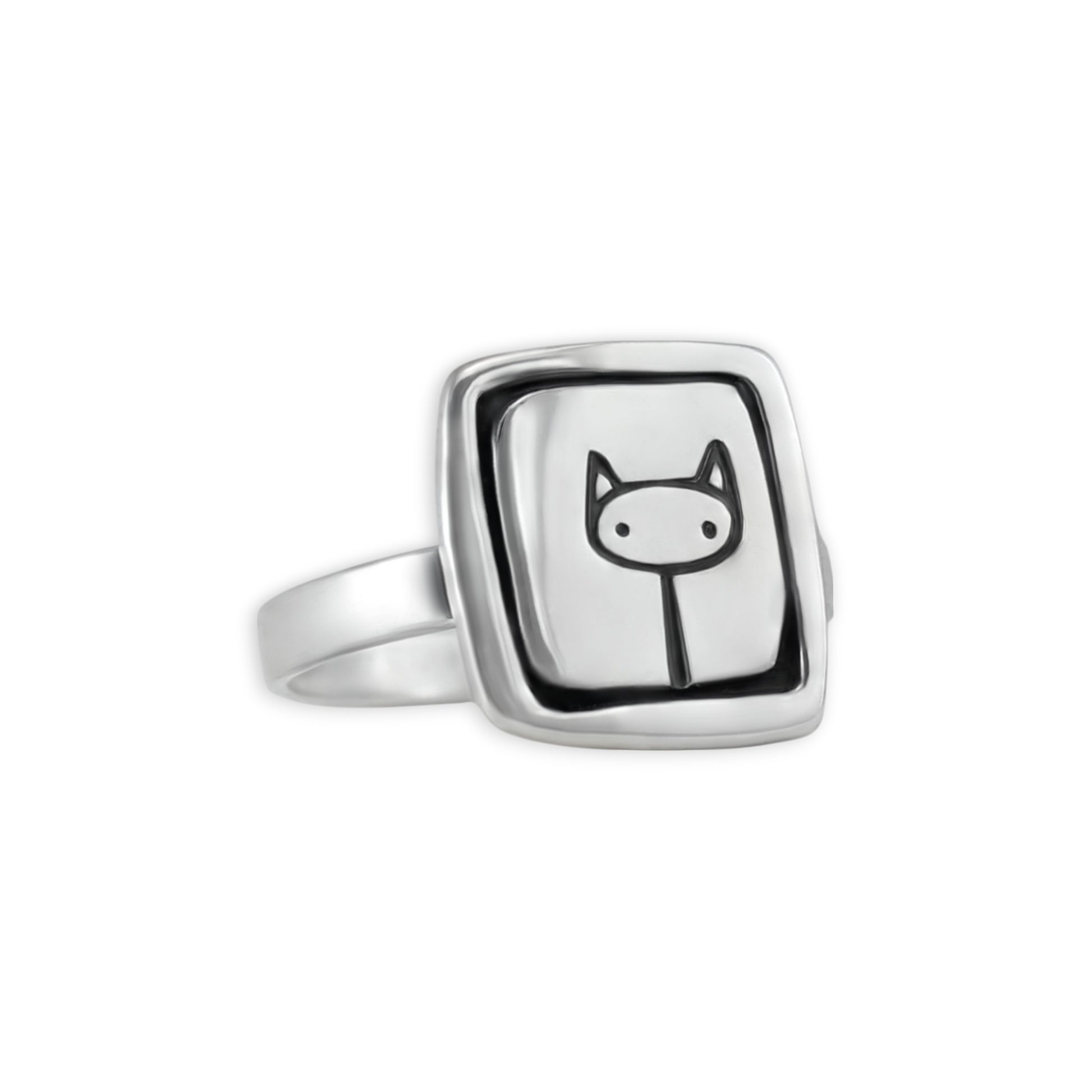 This adorable sterling charm ring has a cat stamping (pulled from my sketching) placed in a smartly framed silver setting. The face of the ring measures 1/2 inch by 1/2 inch.
