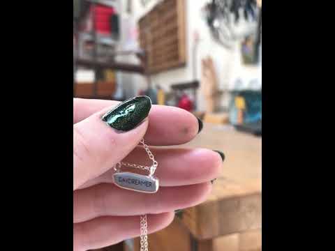 Conversations with yourself? This necklace reverses for two messages. "TALKS TO SELF" and "DAYDREAMER" both written on blue enamel.